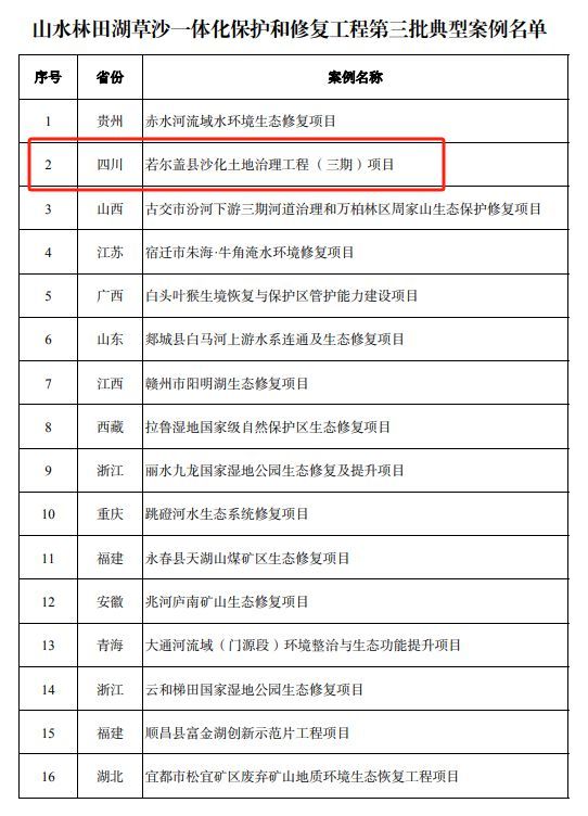 近来,财政部、天然资源部、生态环境部发布山水林田湖草沙一体化维护和修正工程第三批典型事例。16个典型事例中,若尔盖县沙化土地管理工程(三期)项目当选。